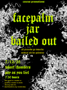 December 6 @ 7:30 pm - 11:00 pmFACEPALM X JAR X BAILED OUT – FUNDRAISER GIG FOR MEDICAL AID FOR PALESTINE