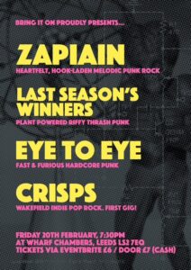 February 19 @ 7:30 pm - 11:00 pmBring it on presents Zapiain / Last Seasons Winners / Eye to Eye / Crisps