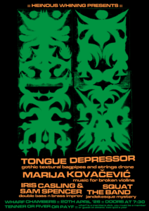 April 19 @ 7:00 pm - 10:00 pmHeinous Whining Presents: Tongue Depressor // Marija Kovačević // Iris Casling & Sam Spencer // Squat The Band