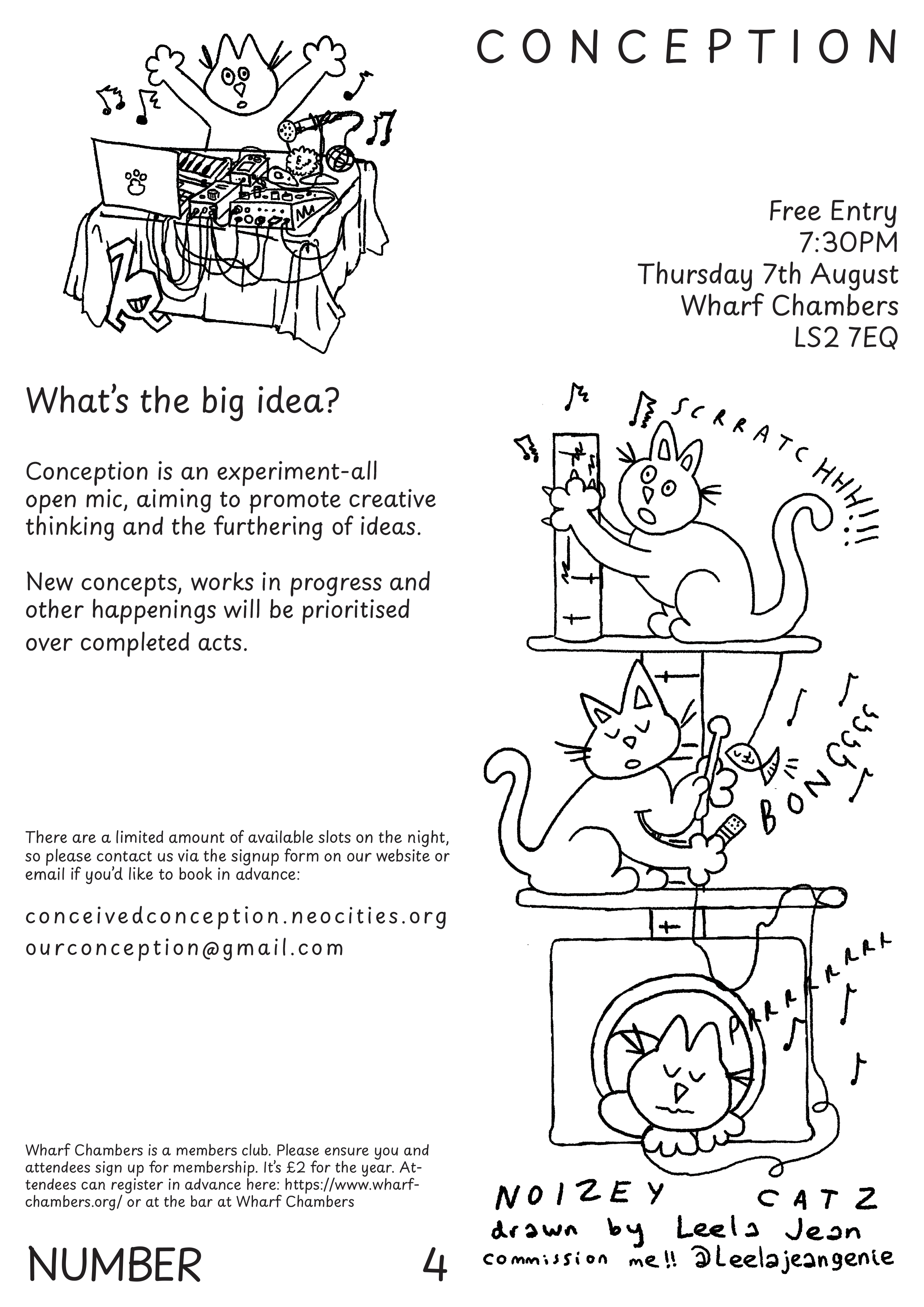 Conception is an experiment-all open mic, aiming to promote creative thinking and the furthering of ideas. New concepts, works in progress and other happenings will be prioritised over completed acts.