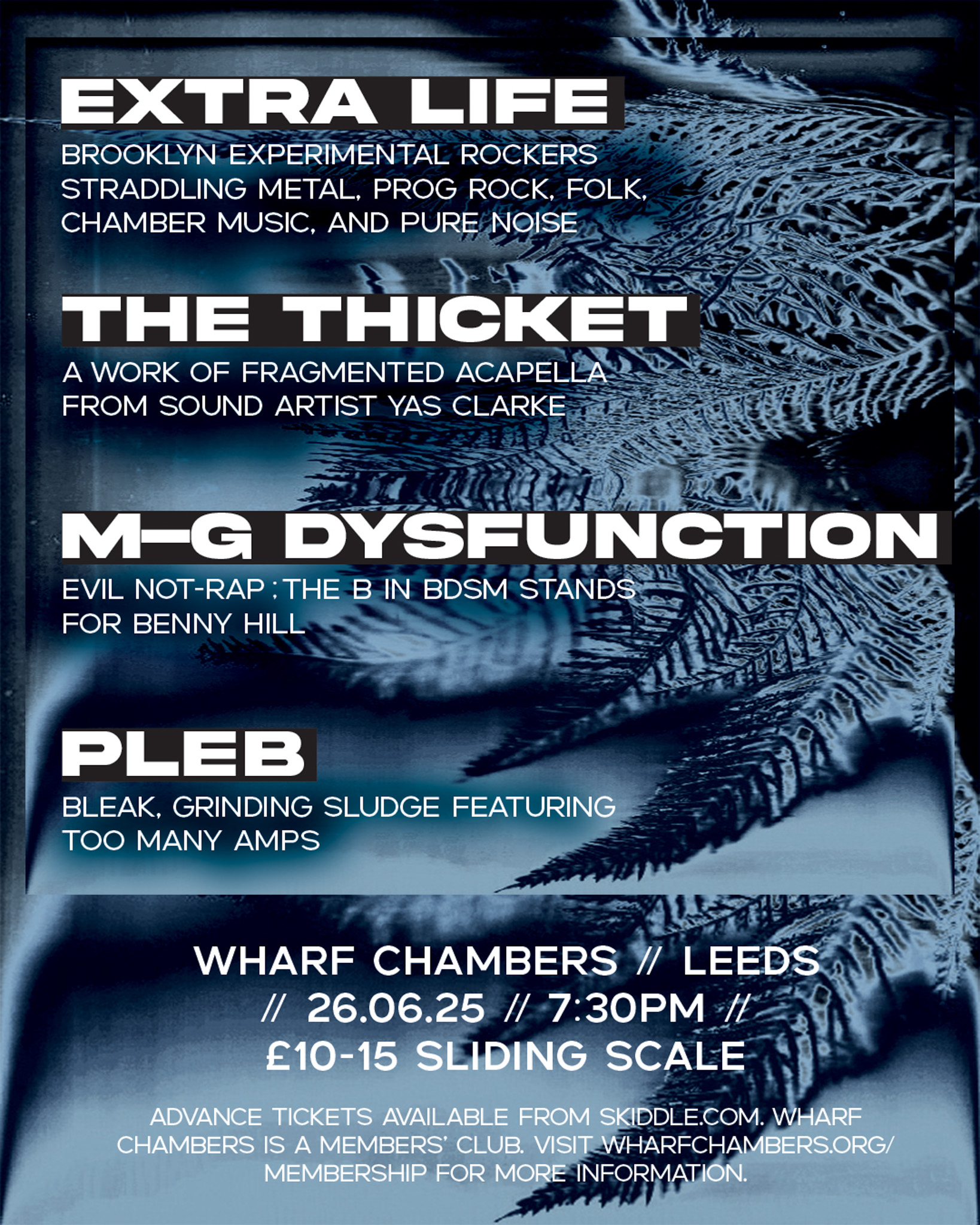 Brooklyn experimental rockers Extra Life return to Leeds in support of their new album ‘The Sacred Vowel’. Plus The Thicket, M-G Dysfunction and Pleb.