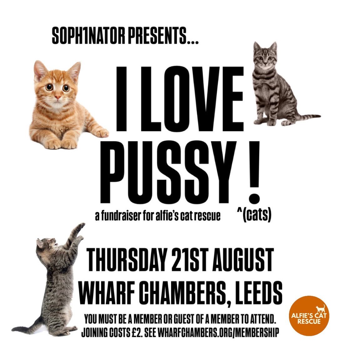A night celebrating pussy (cats) and raising funds for Alfie’s cat rescue! Held at Wharf Chambers, this show will celebrate all things camp and show of some of Leeds greatest queer performers!