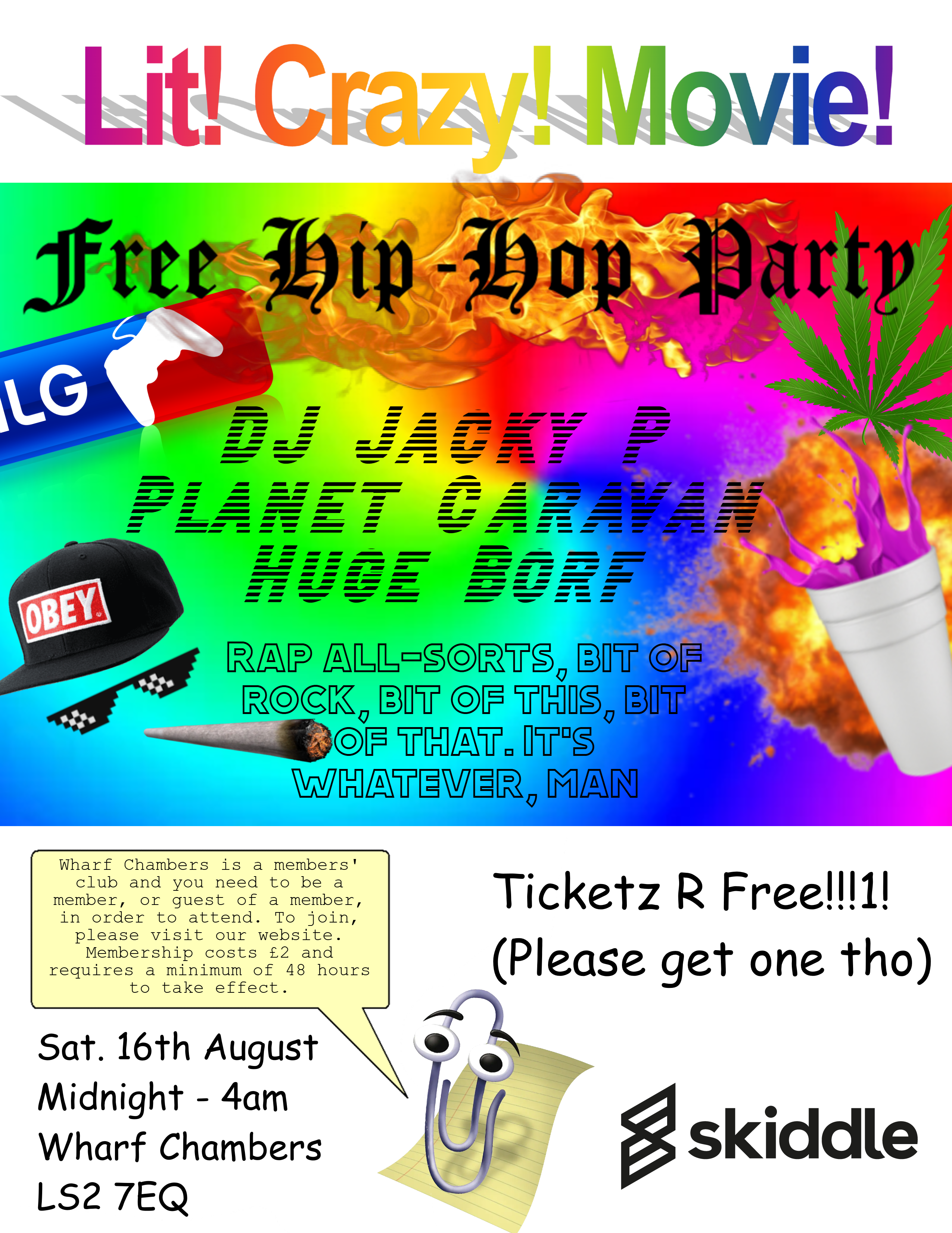 “Bringing you bangers that will make you say “Last night was a movie”. Rap, rage, rock, grime? Who cares. It’s gonna be crazy. If you wanna get turnt you should turn up! Free to all (party to the people).”